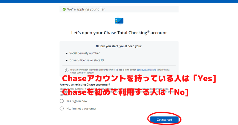 次のページで、Chaseアカウントを持っている人は「Yes」、持っていない人は「No」を選択してください↓