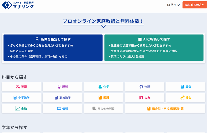 自分にあった先生を検索(科目、学年、対象別から検索可能)
