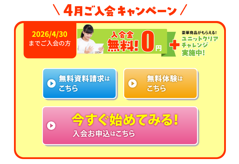 入会金7,700円~11,000円は少し高いと感じてしまいますがタブレット代や解約金は一切かかりません。←2026年4月中に入会手続きをした方は入会金無料です!